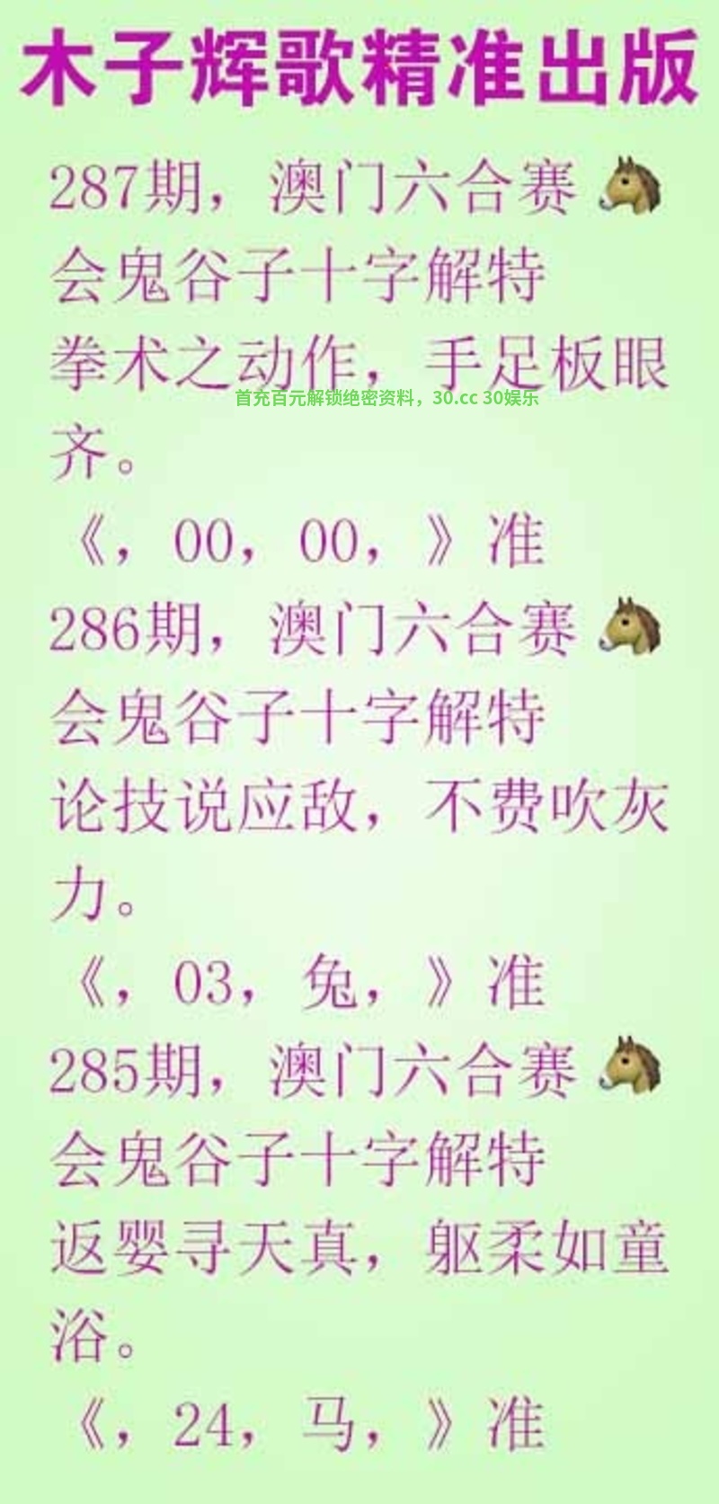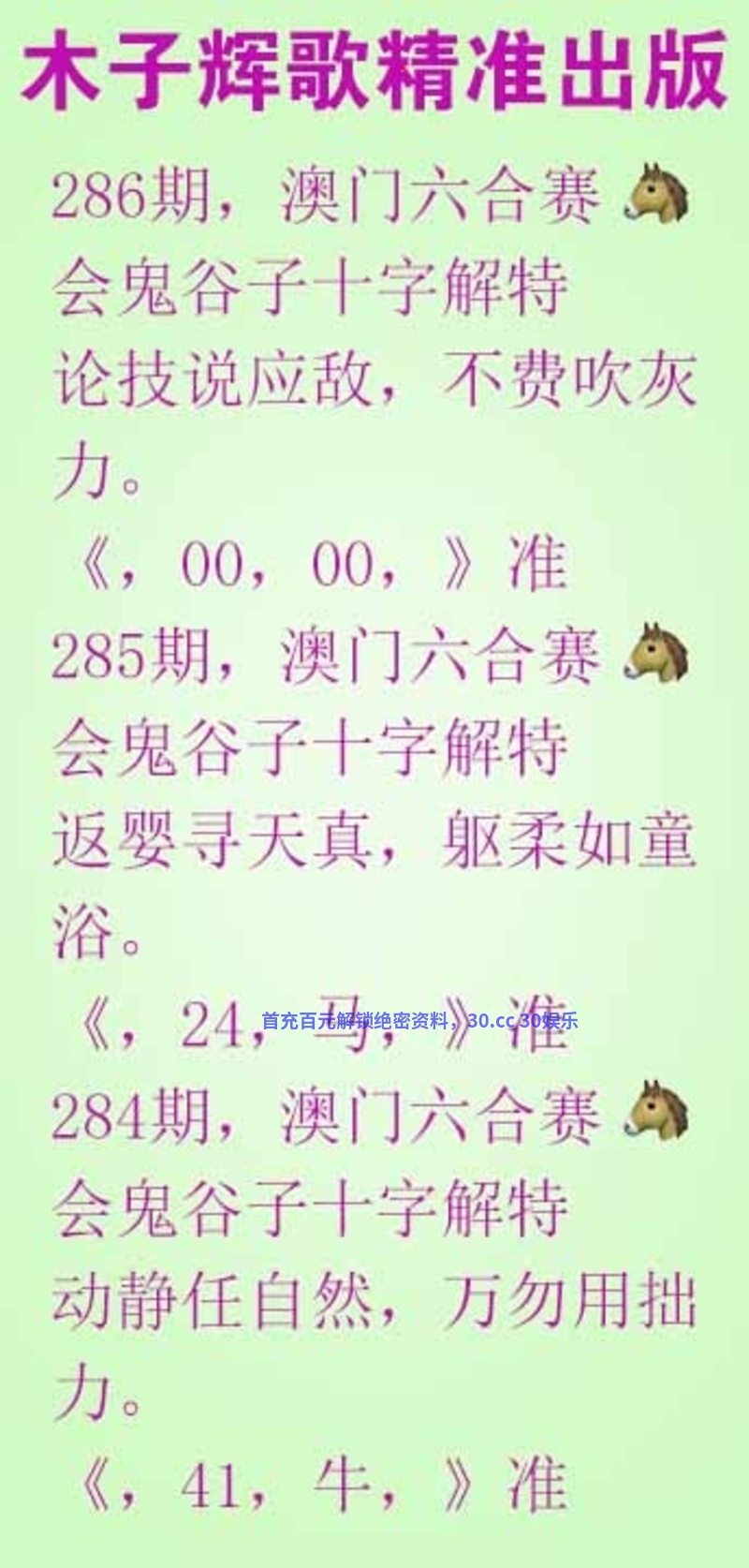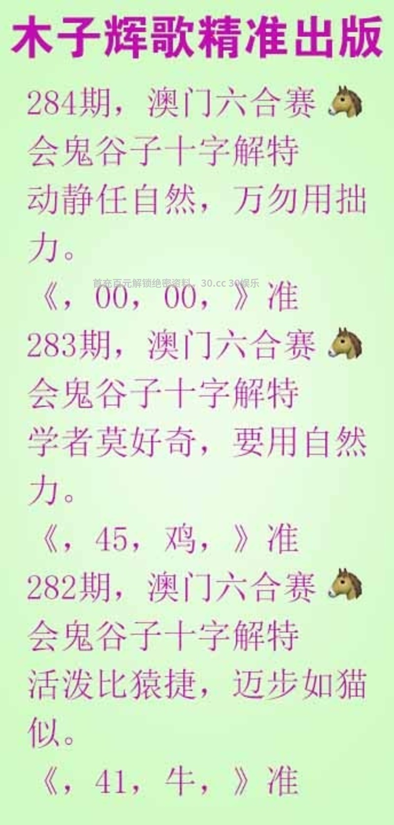 284期:♣天地中特♣天天天♣开:牛41中 285期:♣天地中特♣天天天♣开:马24中 286期:♣天地中特♣地地地♣开:兔03 287期:♣天地中特♣天天天♣开:猴34中 288期:♣天地中特♣天天天♣开:發00中 天肖:牛猪猴马龙兔 💥 地肖:虎鼠狗鸡羊蛇 庄家怕了,密料大放送!(9715888.com) 澳门木子辉歌《五段中特》9715888.com